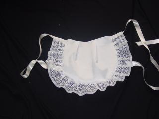 A white satin maid apron completed with lace and ribbon trimmings.