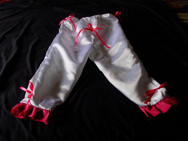 A pair of white satin bloomers with a pink ribbon trim, bows and frilly edging. Custom made for your measurements.